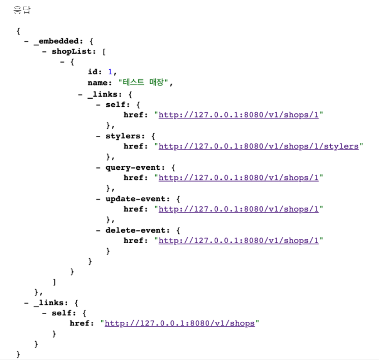 HATEOAS를 조금더 설명하자면 흔히 REST에 대한 응답을 받을 때 이렇게 URL을 직접적으로 받을 수 있다. HATEOAS를 사용함으로써 역동적으로 서비스를 개발할 수 있다고 생각합니다.