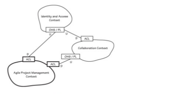 위 그림을 보면 애자일 프로젝트 관리 컨텍스트는 가장 핵심적인 도메인이다. 핵심도메인 임을 감안하였을 때 애자일 프로젝트 관리 컨텍스트는 상위에 두는 것이 아닌 아래에 두어 다운스트림임을 시각적으로 표현하였다. 강 상류에서의 활동이 강 하류의 생물에게 긍정적이든 부정적인 영향을 주듯, 업스트림 모델은 다운스트림 모델에 영향을 준다. 가장 위에있는 식별자와 엑세스 컨텍스트는 가장 멀리 떨어진 업스트림이다. 이는 협업 컨텍스트와 애자일 프로젝트 관리 컨텍스트 모두에 영향을 미친다. 협업 컨텍스트는 애자일 프로젝트 관리 컨텍스트에 비해 업스트림인데, 이는 애자일 모델이 협업 모델과 서비스에 의존하기 때문이다.