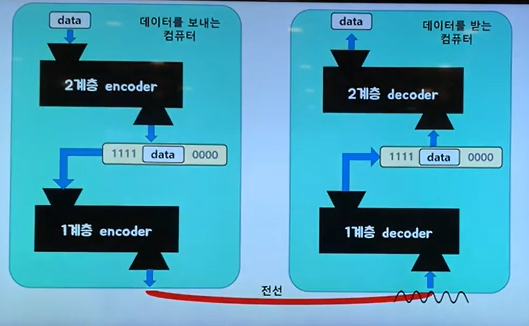 > 0과1의 나열을 아날로그 신호로 바꾸어 전선으로 흘려보낸다 (encoding)