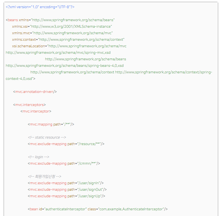위의 예제에서는 AuthenticateInterceptor 외에도 HeaderFilter, BCrpytPasswordEncoder 등을 Bean으로 등록하고 있는데, 이러한 클래스들을 xml에 일일이 적어서 등록한다고 하면 상당히 많은 시간을 차지할 것이고, 생산력 저하를 야기할 것이다. 그렇기 때문에 반드시 어노테이션을 활용한 Bean의 등록을 지향해야 한다.