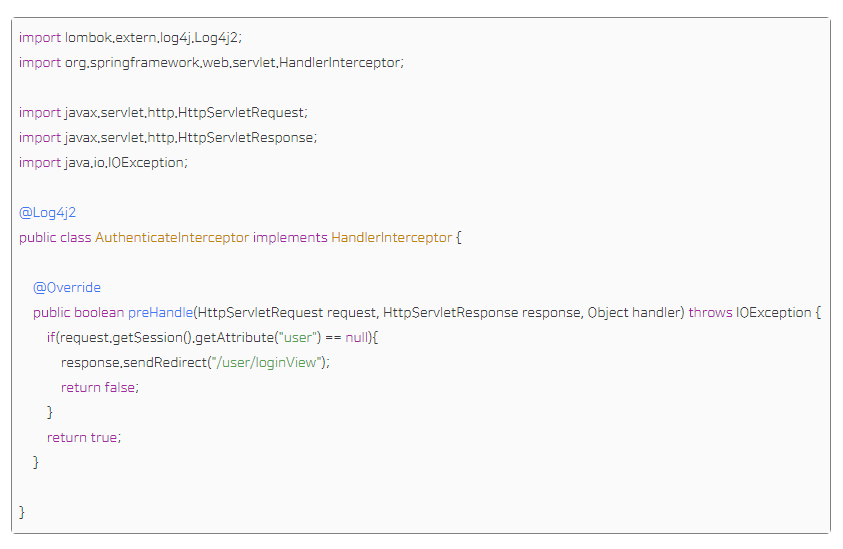 아래의 AuthenticateInterceptor는 해당 요청을 처리하기 전에 Session에 user 객체가 저장되어 있는지를 검사하여 없을 경우 로그인 화면으로 redirect를 보내고 있다.