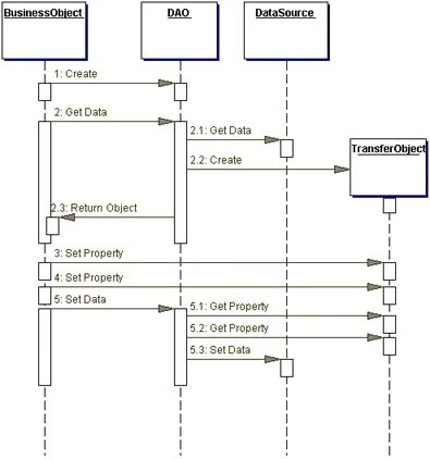 그림을 보면 데이터를 가지고 오는데 있어서 TransferObject를 사용하는것을 볼 수 있다. 이는 우리가 주로 말하는 DTO와 같은 개념이다(혹은 VO라고 알고있을 수 도 있다. 하지만 엄밀히 말하면 이런 계층간의 데이터이동을 위해 사용되는 객체는 TO 또는 DTO가 맞다. VO는 J2EE의 초판에서 TO를 부르던 말이며, 이는 후에 TO로 재명명 되었다. 또한 마틴파울러 또한 같은 개념을 제시했는데, 마틴파울러는 이러한 객체를 DTO라고 불렀다. 이때 마틴파울러는 VO라는 개념을 새롭게 제시하였다. 따라서 현재 우리가 VO라고 명명한다면 마틴파울러의 정의를 따라야 하는데, 이는 TO와는 전혀 다른 개념이므로 데이터 전송을 위한 객체를 VO라 부르는 것은 적절하지 않다.).