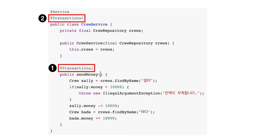 어노테이션이 적용된 메서드는 메서드 시작부터 트랜잭션이 시작되고, 메서드를 성공적으로 끝마치면 트랜잭션 커밋, 도중에 문제가 발생하면 롤백하는 과정이 진행된다. 어노테이션은 데이터베이스에 여러번 접근하면서 하나의 작업을 수행하는 서비스 계층 메서드에 붙이는 것이 통상적이다. 코드에 일일이 붙이기 번거롭고 쉽게 놓칠 수 있다는 단점이 있지만 보다 세밀한 설정을 손쉽고 간편히 할 수 있다는 장점이 있다.