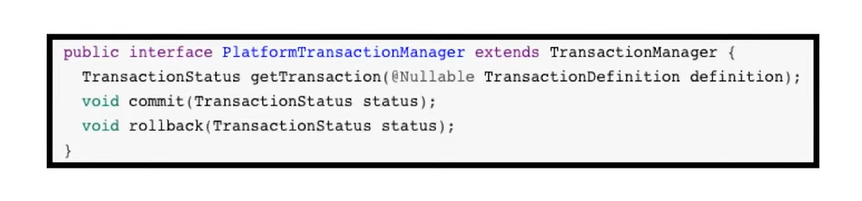 스프링에서는 트랜잭션 추상화 인터페이스인 PlatformTransactionManager를 제공하여 다양한 DataSource에 맞게 트랜잭션을 관리할 수 있다. PlatformTransactionManager은 getTransaction, rollback, commit으로 구성되어 있다. getTransactiond을 통해 파라미터로 전돨되는 TransactionDefinition에 따라 트랜잭션을 시작한다. 트랜잭션을 문제없이 수행하면 commit을 하고 문제가 발생하면 rollback을 한다. getTransaction부터 커밋과 롤백을 하는 동작까지가 트랜잭션의 경계설정이다.